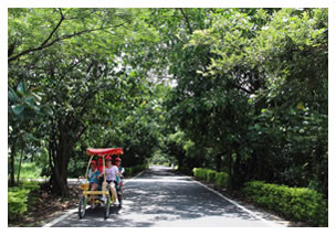 騎自行車遊石門水庫,若不走環湖公路,也可以選擇將自行車寄放在碼頭旁,買張船票暢遊,約五、十分鐘的船程讓人完全釋放身心壓力,迎接大自然的綠意。 |